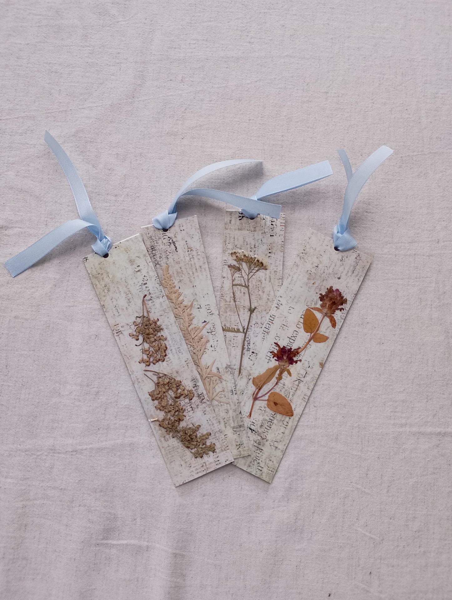 Bylinkové záložky jsou vyrobeny ze zdobného kartonu, sušených lisovaných bylinek (bylinky z vlastního sběru lisované v jedné z mých knih stínů). To vse je zalaminováno.